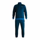 Survêtement équipe de FRANCE. Deux poches latérales sur la veste et le pantalon avec fermeture éclair. Taille élastique avec cordon. Ouverture zippée en bas du pantalon. 100 pour cent polyester. Au dos marquage Tibhar et France.