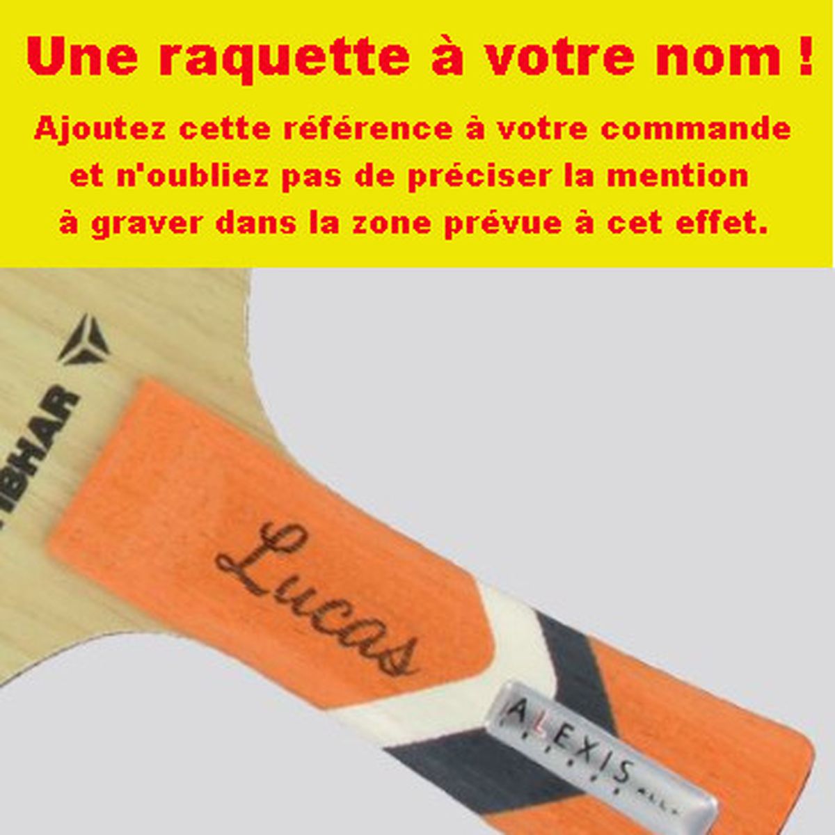 Pour 4,50 euro, nous gravons votre nom ou prénom dans le manche de votre raquette , sur le coffret raquette référence 0300117 ou votre éponge (uniquement les références 0610106, 0610112, 0610113, 0610117) !